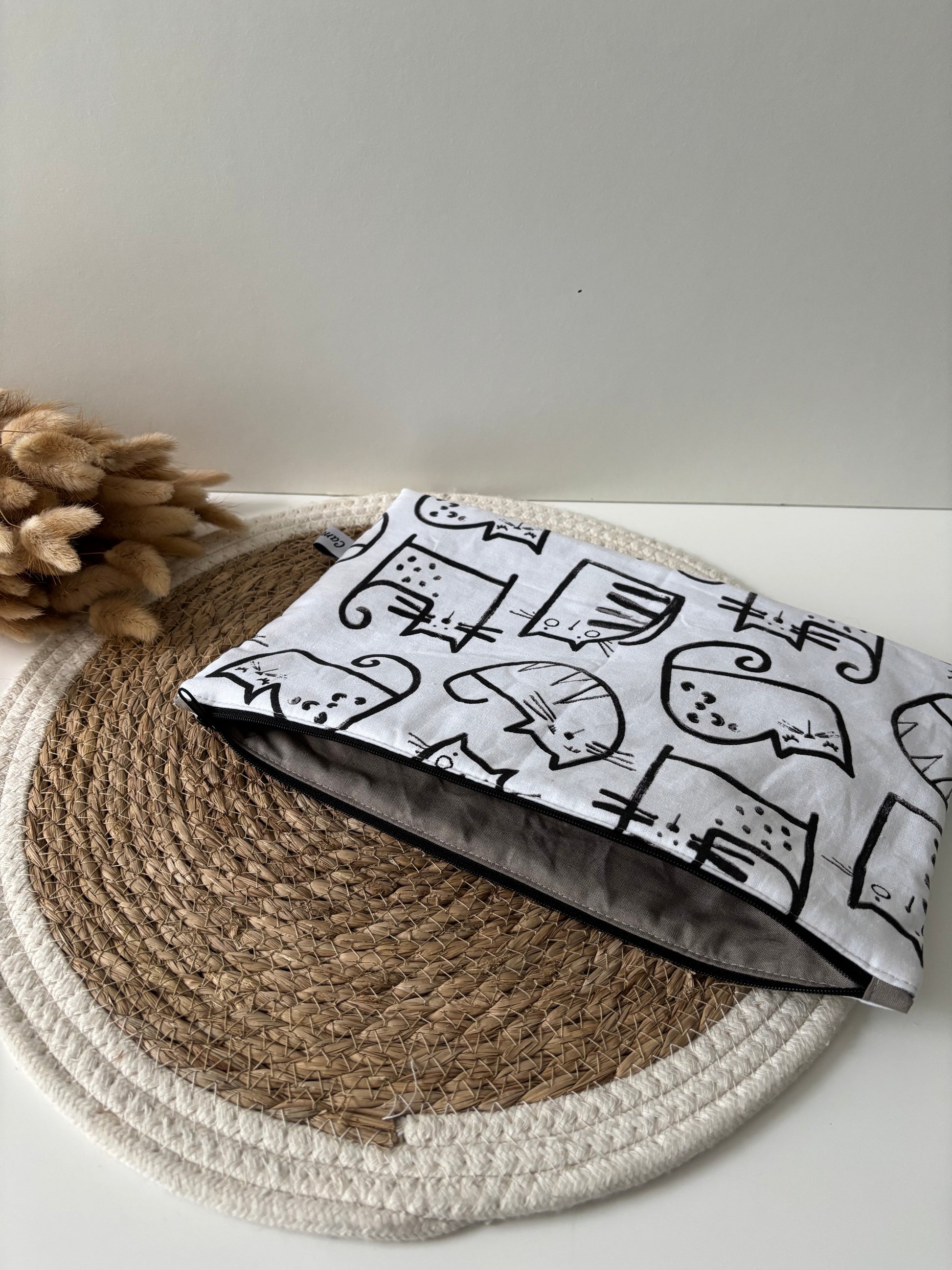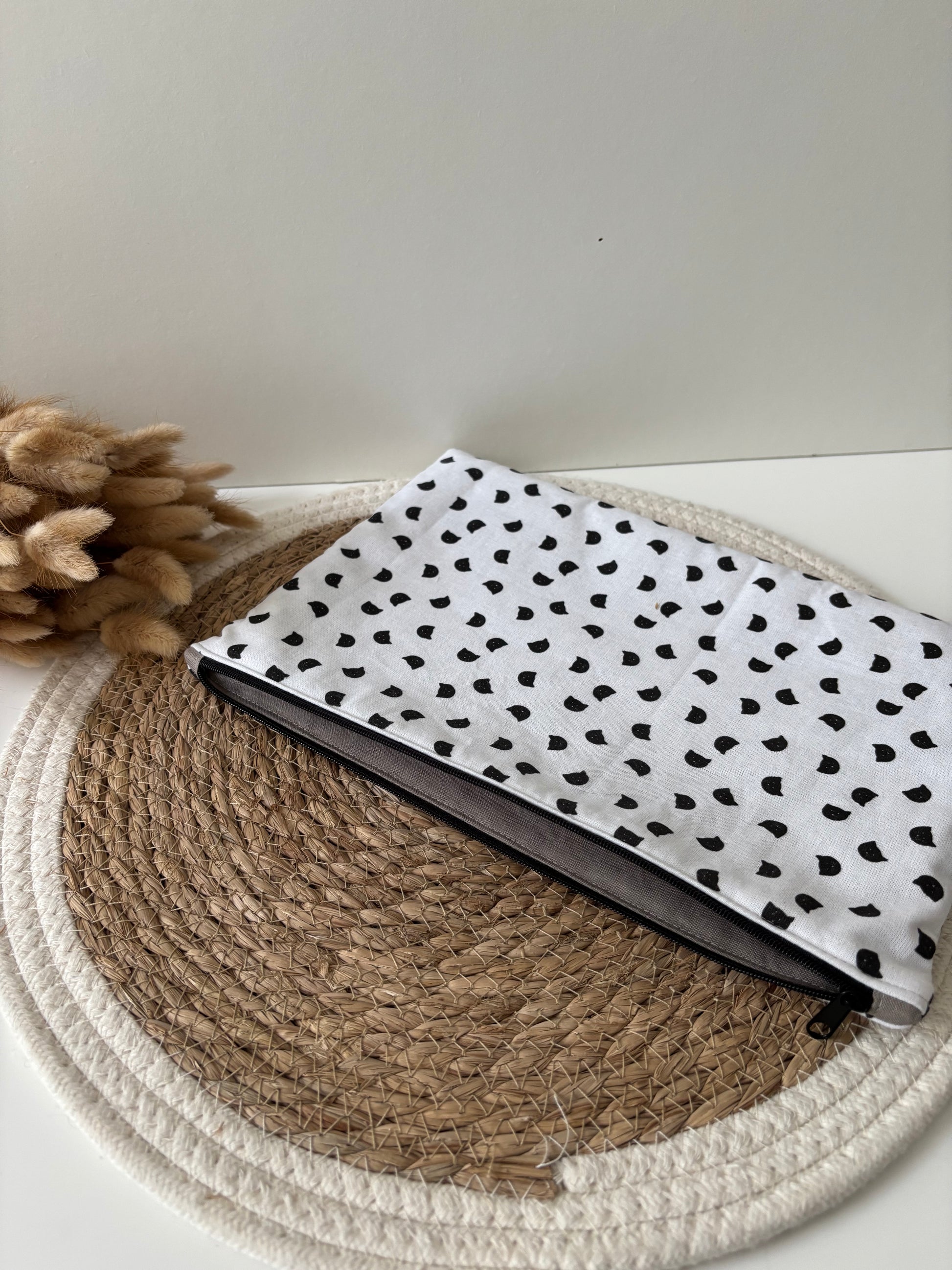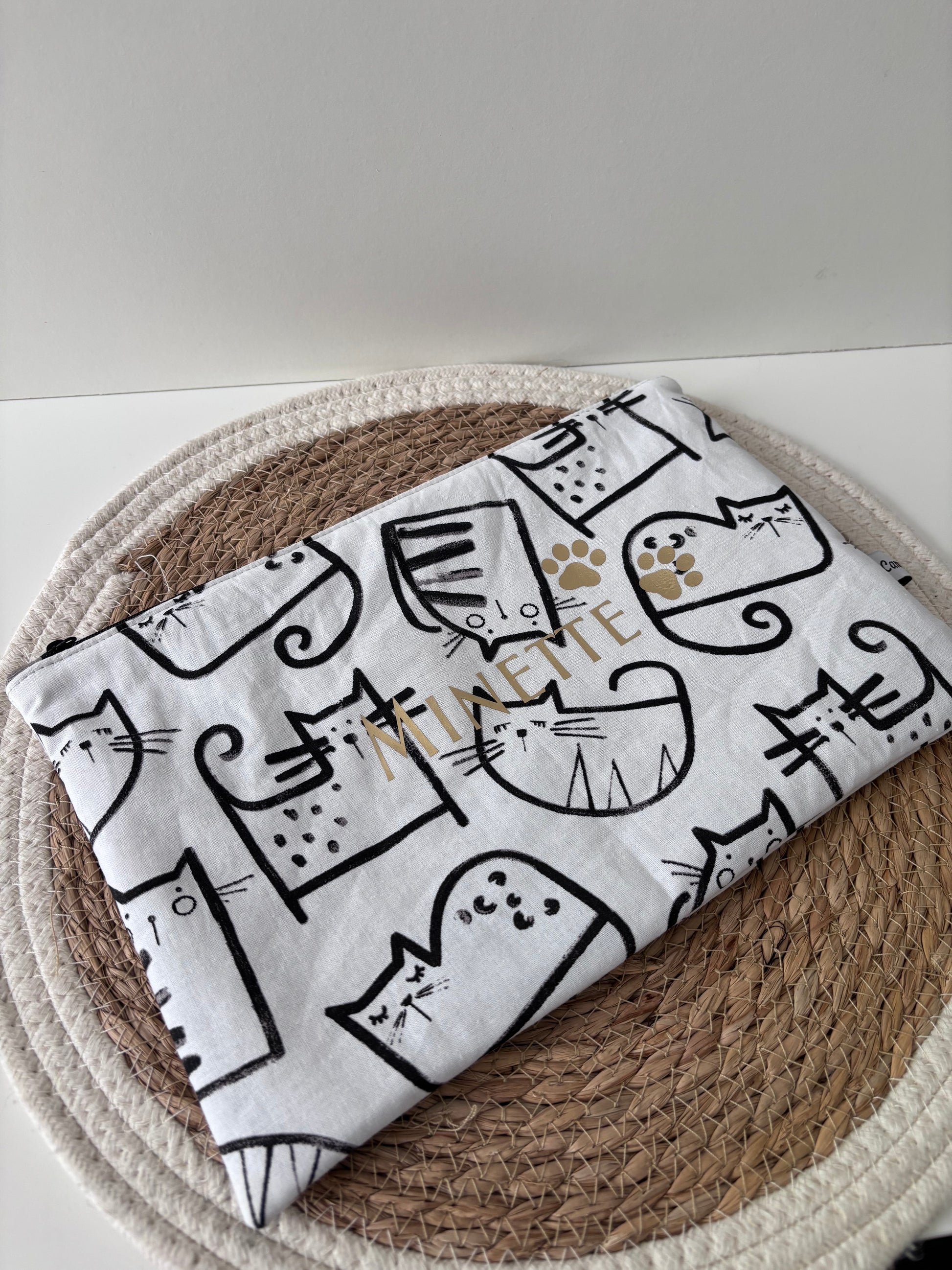 Chaque pochette est réalisée sur mesure, avec les tissus de votre choix disponibles dans la Tissuthèque. Vous pouvez aussi choisir la couleur de la personnalisation (noir, blanc, rouge ou doré ✨).